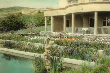Die Villa betrat man über die gartenseitige Säulenloggia, durch eine Glastüre kam man in die holzvertäfelte Halle, von dort in Jagdzimmer,