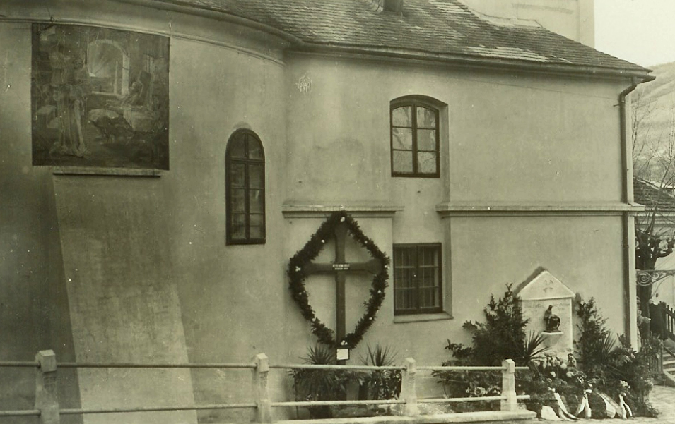 Der Vater von Frau Gerti Hessel, Herr Viktor Krikawa war zu dieser Zeit (1928/29) Obmann des katholischen Männervereins und suchte gemeinsam mit dem Pfarrer Christoph Binder das Motiv aus dem Schaffen des Künstlers Alfred Rethel aus.