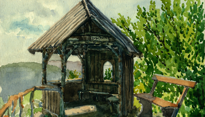 Der sechseckige Holzbau war rundherum offen und mit Holzlatten gedeckt. Im Inneren befand sich ringsum eine Bank.